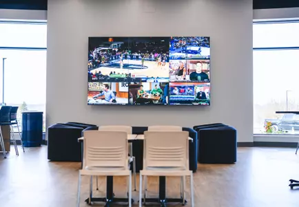 An advanced audiovisual system in the space features large video walls, perimeter TV displays, a surround sound speaker setup and wireless microphone systems. Additionally, a new receiving and loading dock area was constructed to facilitate the efficient operation of the club and to provide a direct link to the main concourse of the Coliseum.