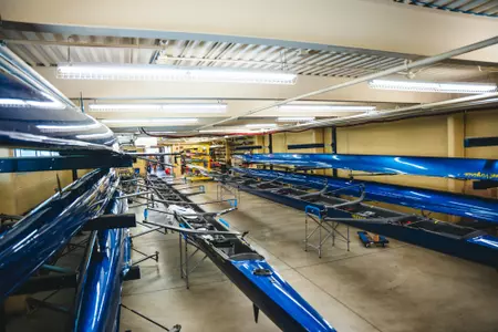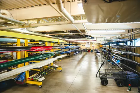 The West Virginia University Boathouse is located in Morgantown’s Wharf District along the Monongahela River. Constructed in 2007 below The Caperton Trail, the attractive climate-controlled facility houses the WVU fleet that includes (4) eights, (4) pair/doubles, (3) fours, and (1) single.